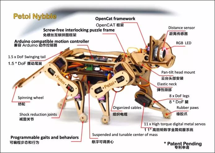 Nybble 建立在开源平台上,除了运动,还可以通过编程「教导」技巧、步态、行为等,实现不同的功能,拥有无限的可能性。
