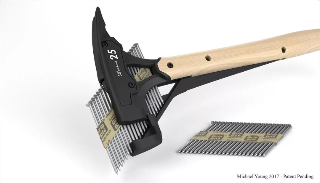Hammer with Collated Nail Dispenser 则结合打钉枪的优点,使传统锤子也可以像打钉枪一样使用一整排的钉子,而不必使用散乱的单个钉子。