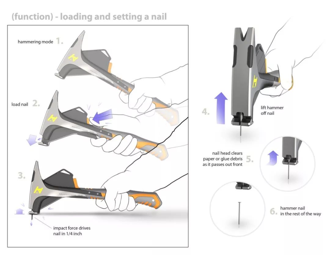 由此,Hammer with Collated Nail Dispenser 可以像打钉枪一样一个接一个快速地完成乏味的锤钉任务。