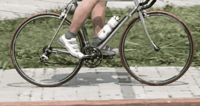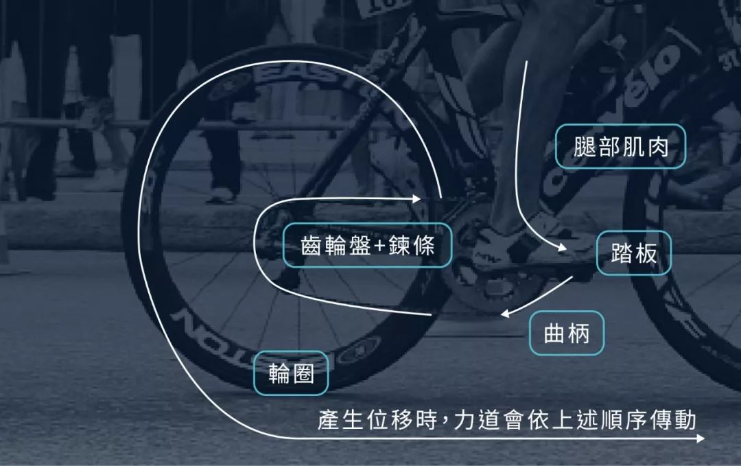 运动员双脚踩踏施力,力量通过踏板、大盘、链条等传统系统转化为动力前进。