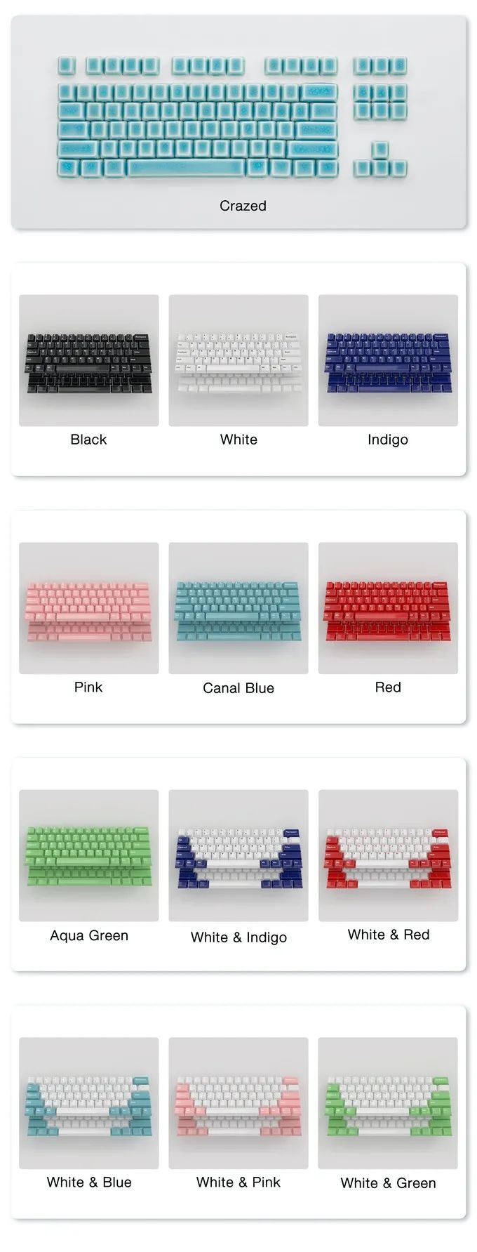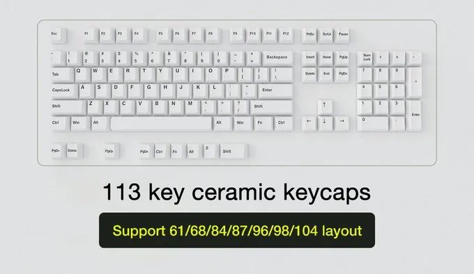 总共包含 113 键帽,可以安装 61/68/84/87/96/98/104 机械键盘。
