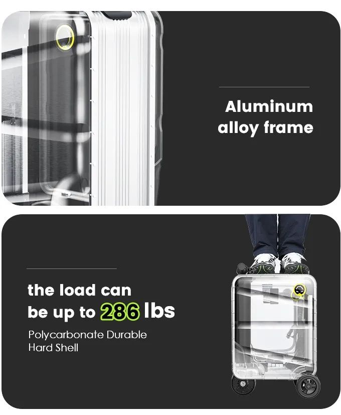 拥有独特的专利设计,铝合金框架,PC材质外壳,一体式框架技术,确保行李箱稳定,不易变形。负载可达130kg,约合286.6磅