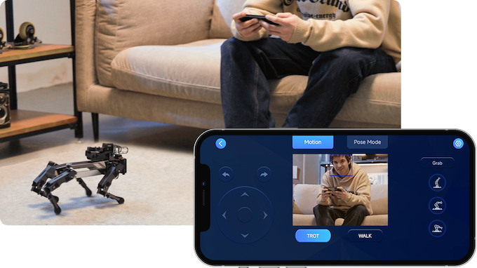 XGO 2 带有三种不同的步态策略和规则,分别是小跑、步行和高步行。XGO 2基于逆运动学算法,结合机器动力学优化,实现基于小跑步态的全向运动控制,身体十二自由度运动控制,并支持姿态和运动控制的叠加控制。