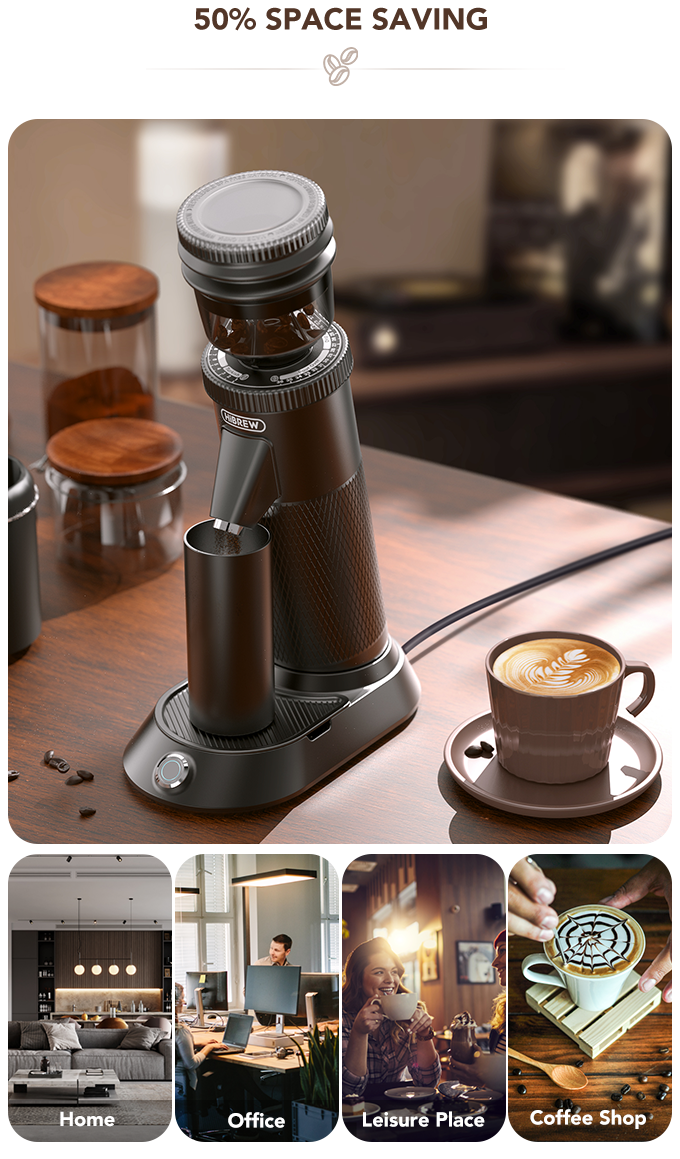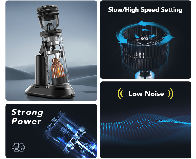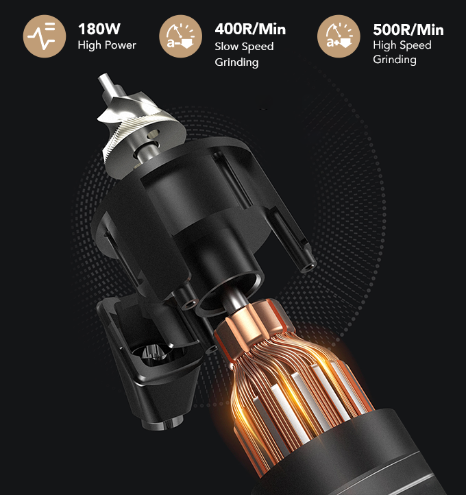 这种强大的直流电机可将噪音降低 5-15%,使用寿命比普通交流电机长 20-30%。它坚固,节能,可以轻松改变速度并稳定输出扭矩。你只需按一下按钮即可快速研磨咖啡豆,并立即享用咖啡。