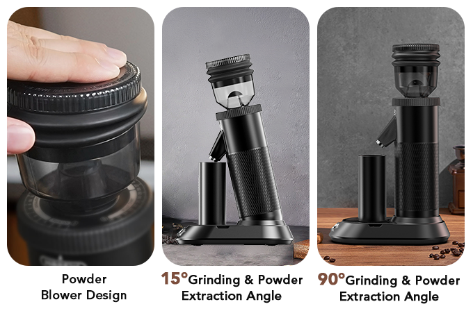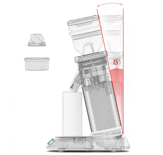 HiBREW G5经过数千次实验,设计了研磨或出粉的两个调整角度:15°和90°。15°研磨或粉末出口角度是使用动态美学原理精确计算的。这个角度提高了研磨效率,保证了更平滑的粉末输出,并有效避免了粉末散射。