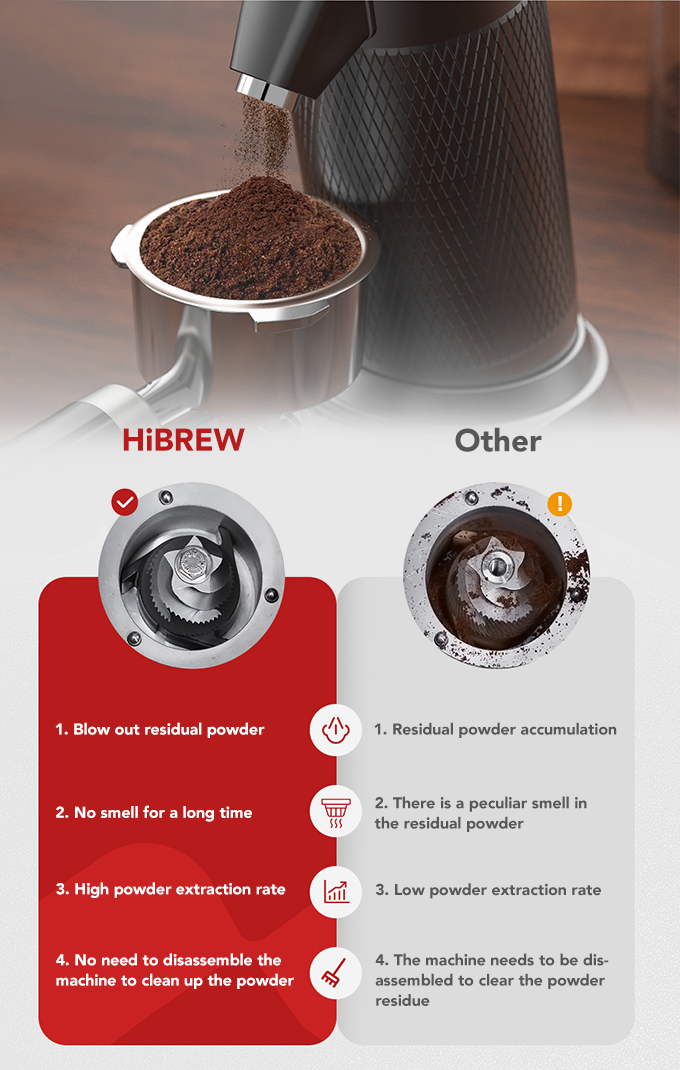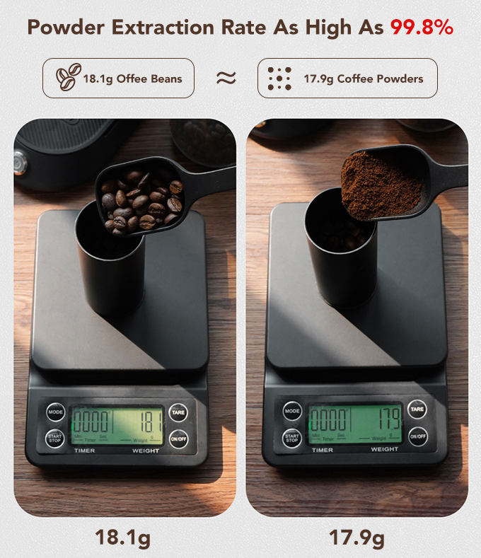 得益于顶部独特的吹粉器设计,HiBREW G5实现了令人印象深刻的99.8%的粉末提取率,这意味着与其他常规研磨机相比,你可以从相同数量的咖啡豆中提取更多的咖啡粉。它将咖啡豆精确研磨到所需的稠度,减少咖啡豆浪费。
