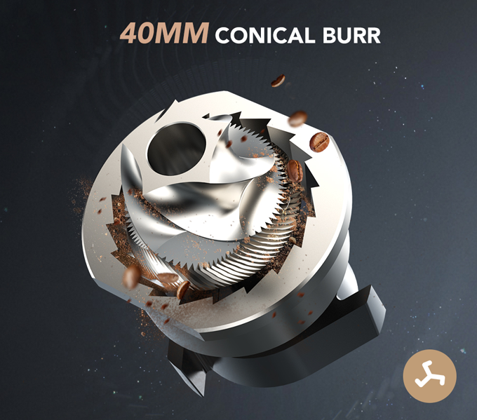 专业级 40 毫米锥形毛刺具有高效的研磨能力,可以将咖啡豆研磨成均匀细粉,残留物最少。