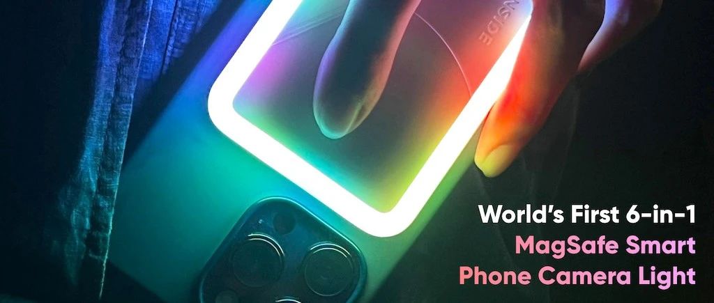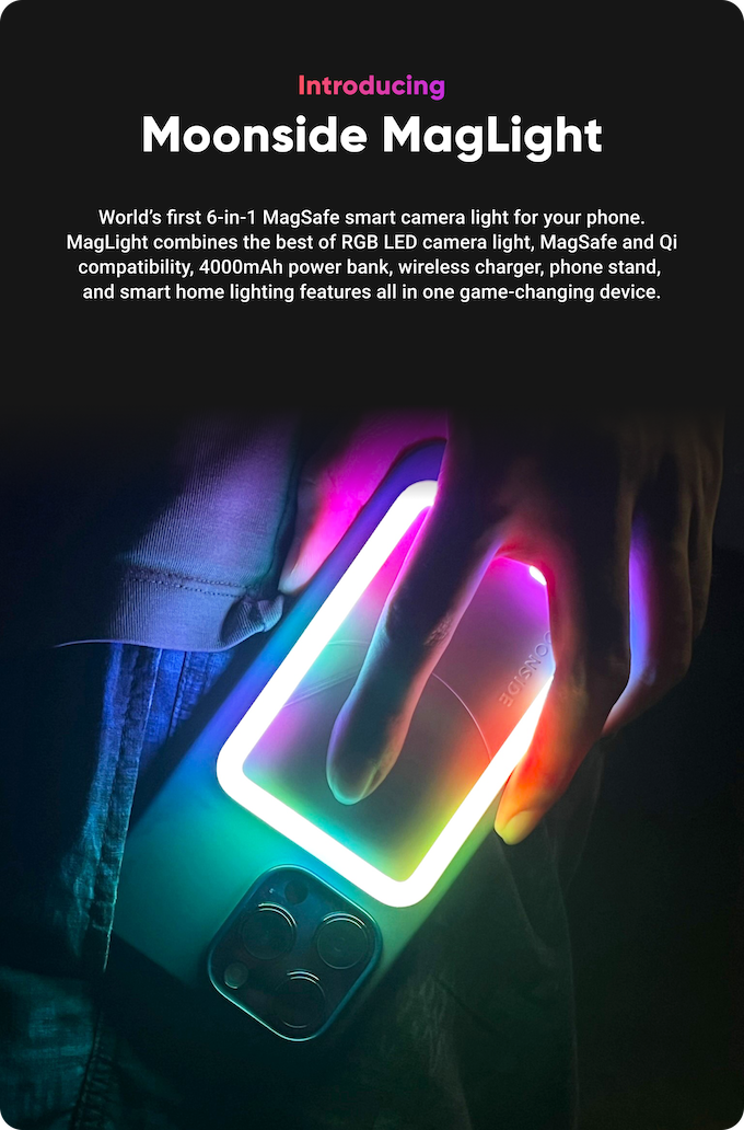Moonside MagLight是一款智能相机灯光,专为MagSafe兼容性而设计,可轻松连接到你的iPhone或其他支持MagSafe和Qi2的设备上。