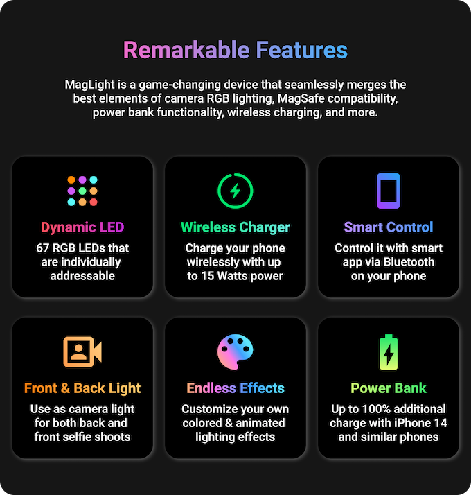MagLight的67个LED灯分为前后两个区域,提供全方位的照明。贴上电池包,你的iPhone相机即可获得明亮的自定义照明(680流明),可用于各种创意用途。这67个LED灯可以以多种方式进行控制。