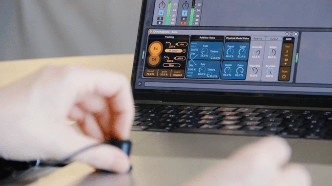 团队还在开发一个 Max For Live 设备,以便与 Chromaplane 进行通讯。该设备控制基于两个拾音线圈检测到的音高和包络的二声道数字合成器音色。MIDI 跟随器还输出音符和 CC 值,可以路由到其他 Ableton 乐器。