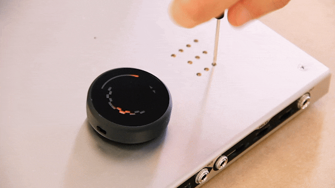 调音器会监听电磁场并显示当前检测到的音符。它精准、可靠,并使用单个纽扣电池供电。你可以利用调音器帮助你在没有任何电线或连接的情况下静音调校 Chromaplane 的电磁场。