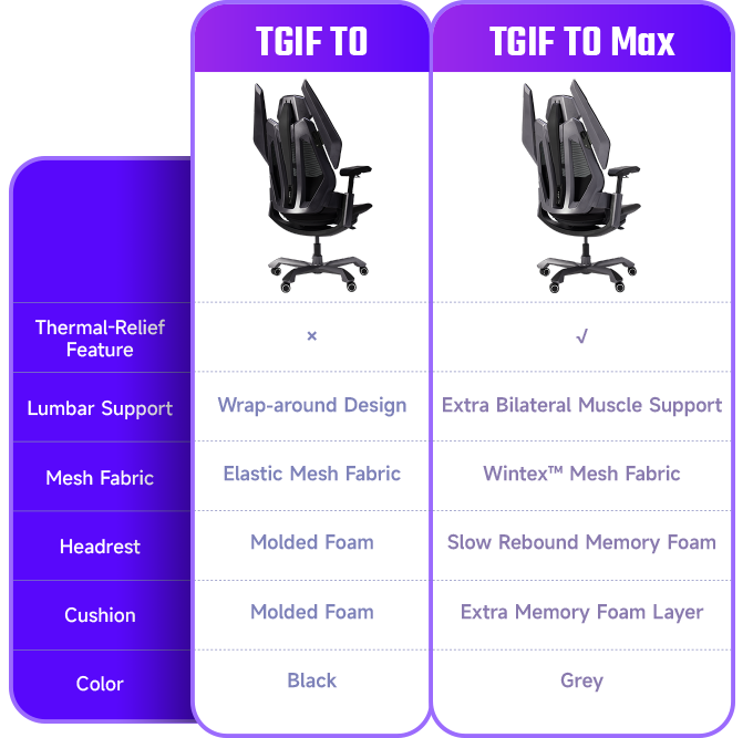 TGIF有两个版本:TGIF T0和TGIF T0 Max。与T0相比,Max版本进行了更多高级功能的升级,包括标志性的热缓解功能和多个材料改进。TGIF T0 Max的腰垫经过与专业运动康复中心的合作,增强了对下背部肌肉的双侧支撑。靠背现在采用Wintex?网布面料,具有优越的弹性、透气性和耐用性。此外,头枕和坐垫使用了航空科技记忆泡沫,帮助均匀分配压力。