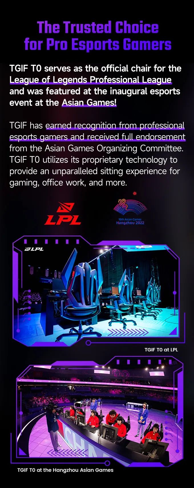 TGIF T0的人体工学游戏椅为应对疲劳而设计,确保职业玩家在长时间游戏过程中享有无与伦比的舒适感。