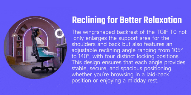 TGIF T0为各种体型的用户提供优质的坐感体验。宽座椅、更深垫子和更大的靠背,确保该椅子为每个人提供一种宽敞和奢华的个人空间,轻松适应不同的坐姿和身体动作,确保舒适。