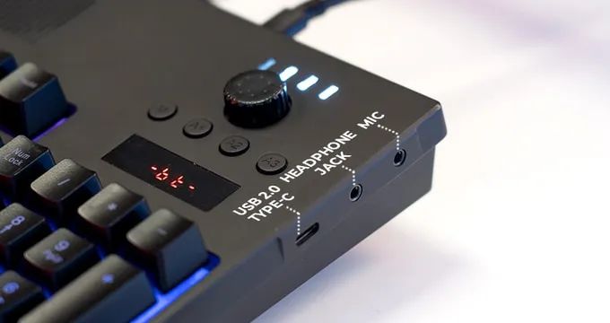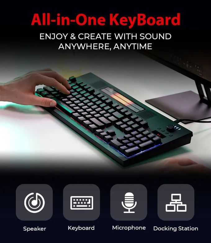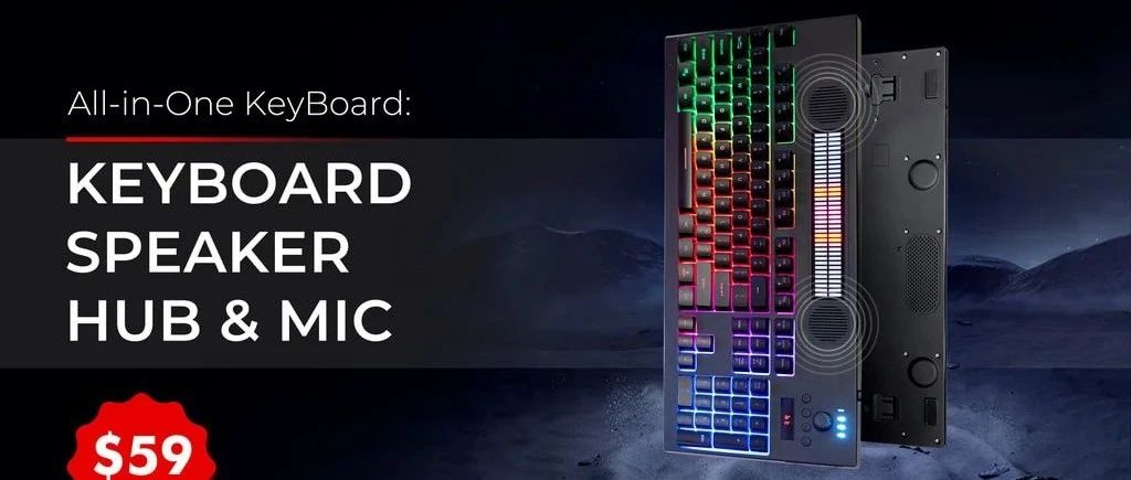 AK01游戏键盘是一款全合一键盘,包含了键盘、扬声器、集线器和麦克风等功能。