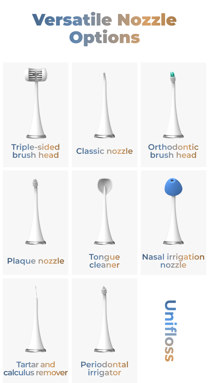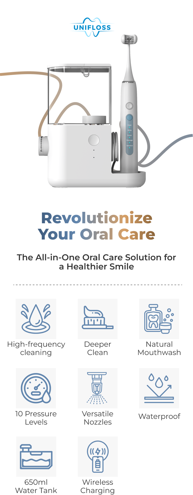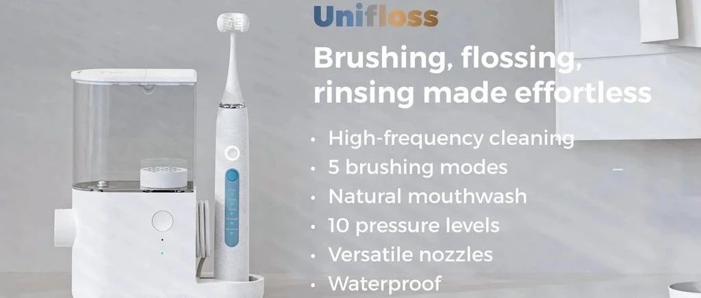 Unifloss是一体化口腔护理解决方案,将电动刷牙、水牙线和天然漱口水的制作融为一体,简化口腔护理,使口腔护理变得更快、更有效。
