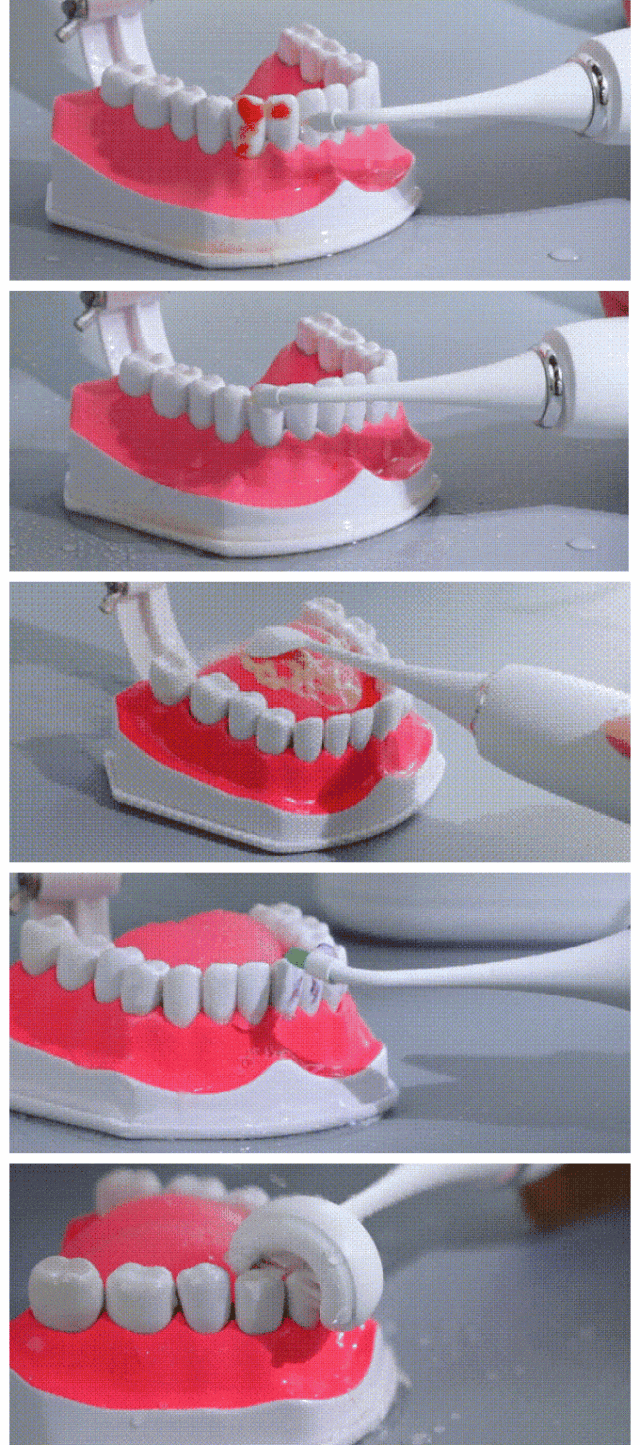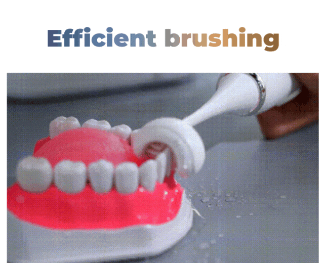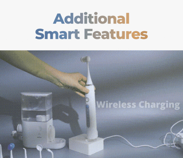 譬如Triple-sides brush head,同时清洁每颗牙齿的三个表面,将刷牙和冲牙结合为一个动作。六个出水孔提供水流,实现同步冲牙,确保更彻底的清洁。