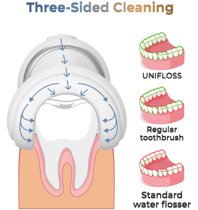 Unifloss的三面刷头旨在通过同时清洁每颗牙齿的三个表面来提升刷牙效率。这一创新设计不仅节省时间,还确保更彻底的清洁,能够触及传统牙刷可能遗漏的区域。