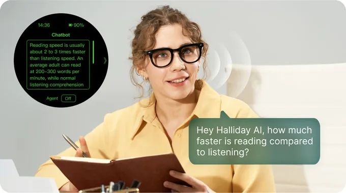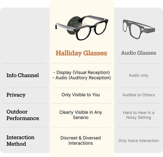 体验Halliday眼镜带来的视觉信息处理能力。凭借尖端的显示技术,Halliday眼镜使你能够以比仅音频解决方案快五倍的速度获取信息。隐形显示利用视觉处理的力量,以无与伦比的速度和清晰度传递信息,即使在嘈杂的环境中也能做到。
