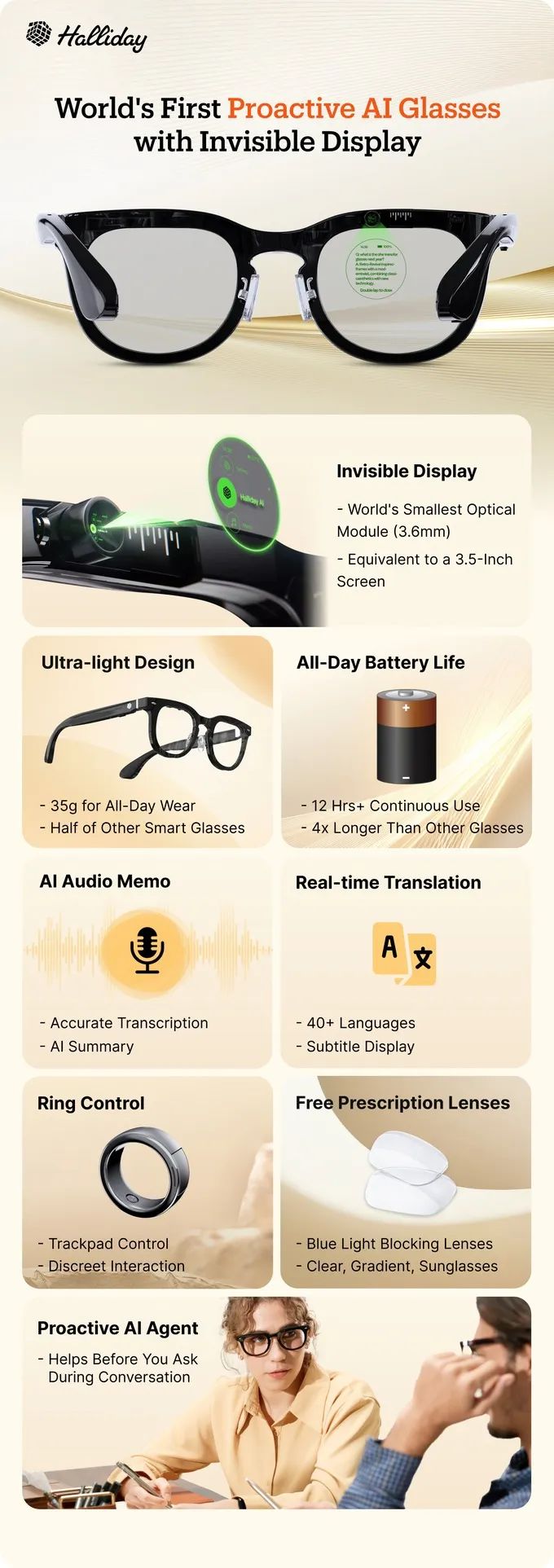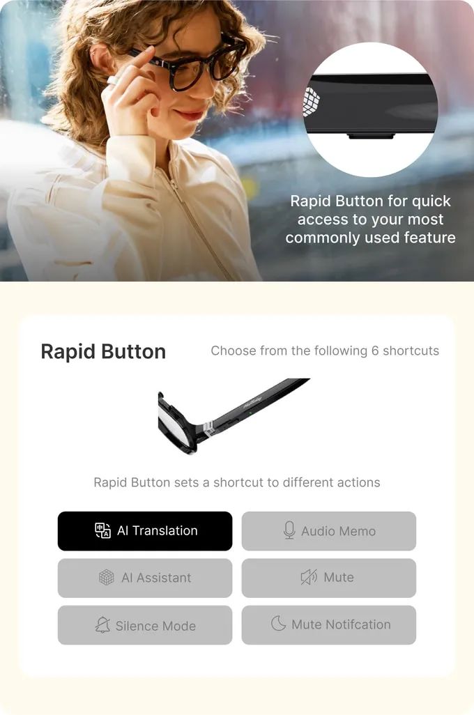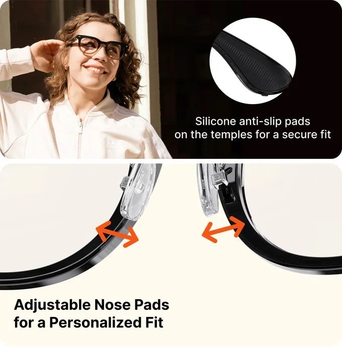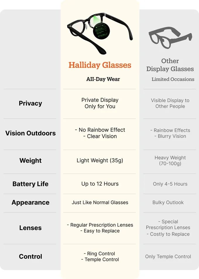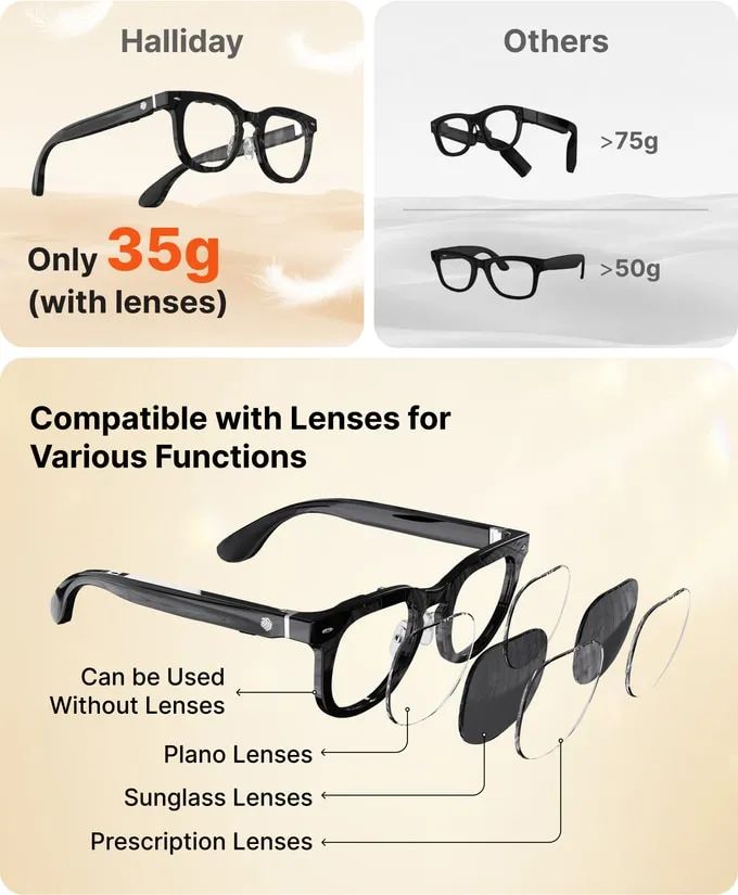 流线型设计、轻便的构造(35克)、全天候电池续航(12小时以上)以及与常规处方眼镜的兼容性,使Halliday眼镜成为舒适的日常智能眼镜,甚至可能比你现在佩戴的眼镜更舒适。