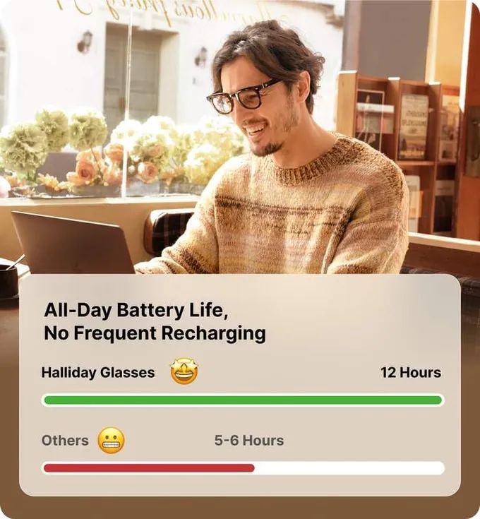 Halliday眼镜在正常使用情况下可持续超过12小时,连续使用可达8小时。每天只需快速充电45至60分钟,确保它们随时准备好迎接新的一天。