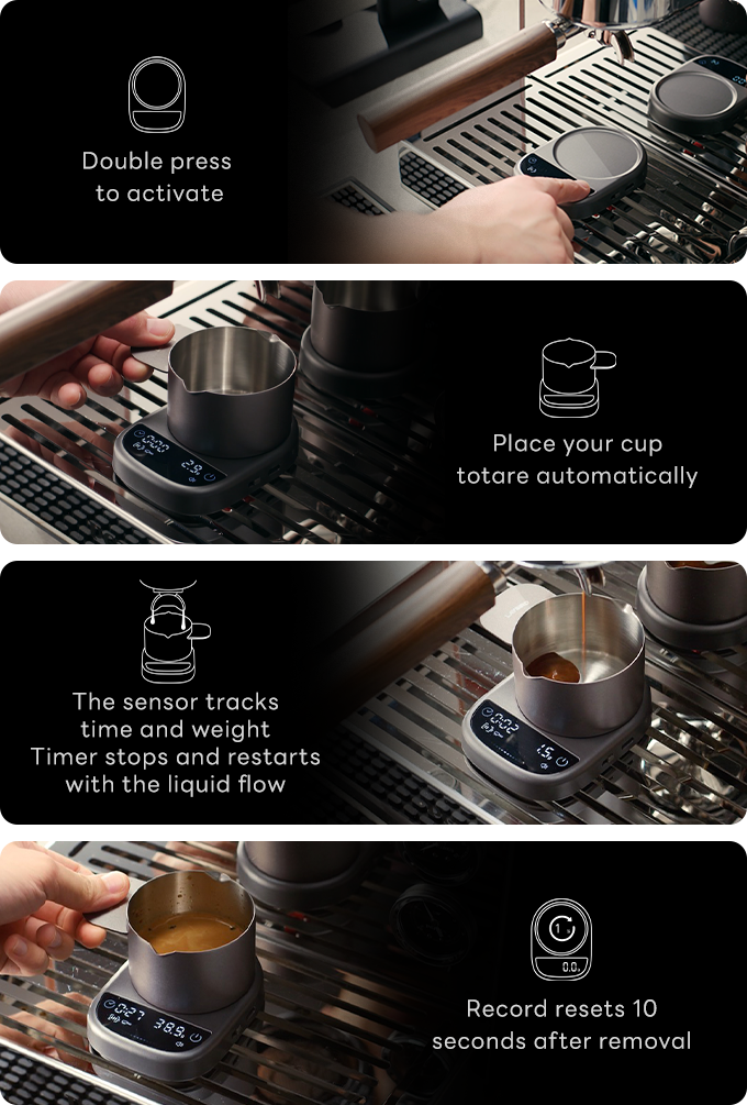 - 在将浓缩咖啡从秤上移除后,提取记录将在10秒内重置。