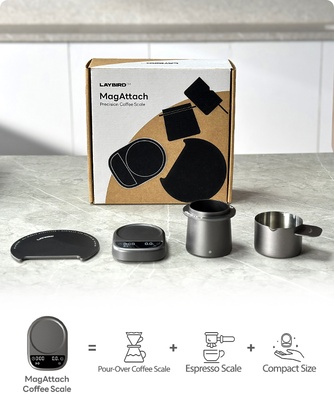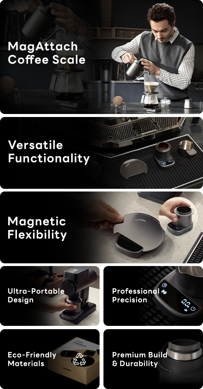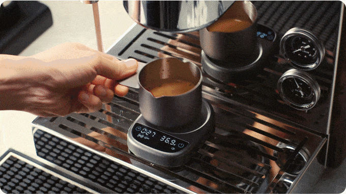 你现在可以简单地将计量杯或浓缩咖啡杯固定在MagAttach秤上,将其转变为称量豆、粉或液体的精密工具。每一步都变得流畅、专业且轻松。