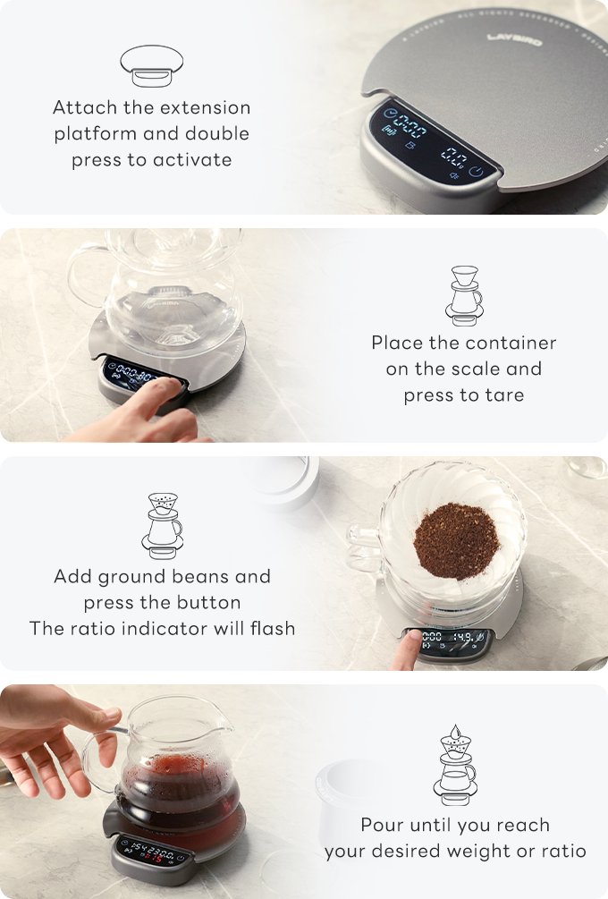 然后切换到扩展平台,以获得更大的称重区域,适用于手冲或浓缩咖啡。