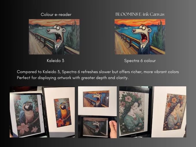 BLOOMIN8 是一款无线智能彩色电子墨水画布,像纸张一样展示你的图像——充电一次,使用多年。