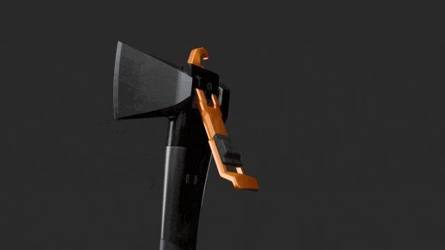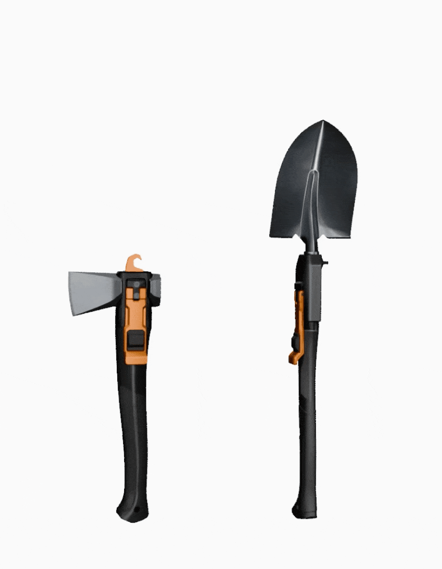AM-V3由一把手柄和两个刀头组成(斧头和铲子),刀头可配置/旋转四种方式,提供六种重型工具。