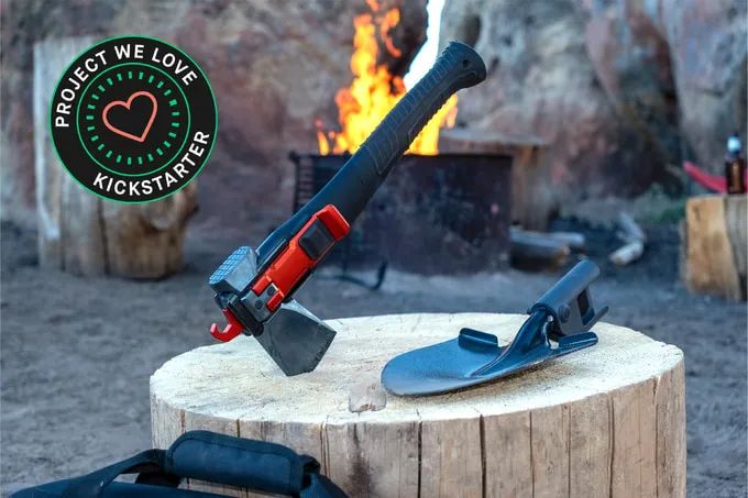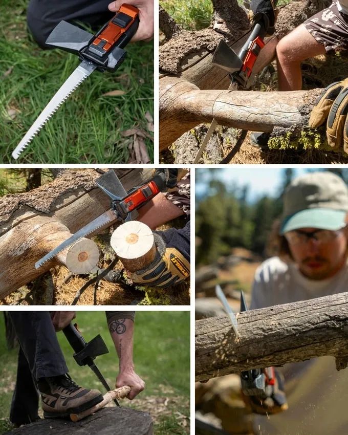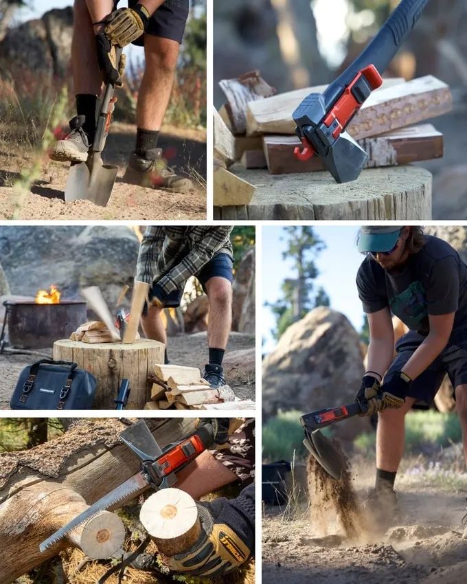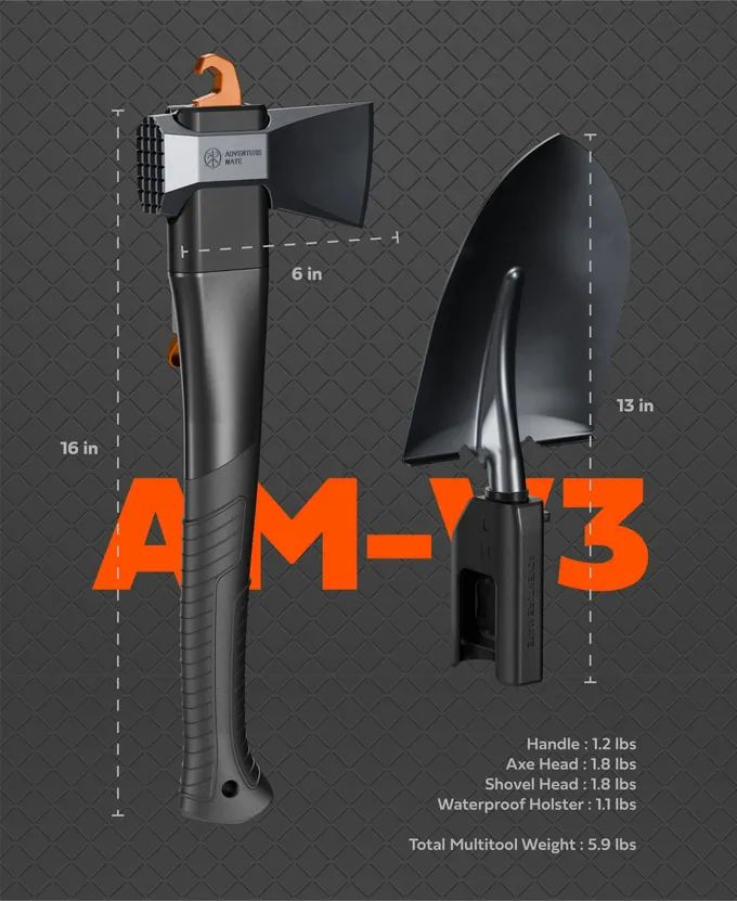 Adventure Mate V3是一款六合一多功能工具,专为野营、越野和户外探险设计。它结合了全尺寸斧头、锯子和可转换为挖掘工具的铲子,以及锤子和钩子,全部装配在一个紧凑的套件中。