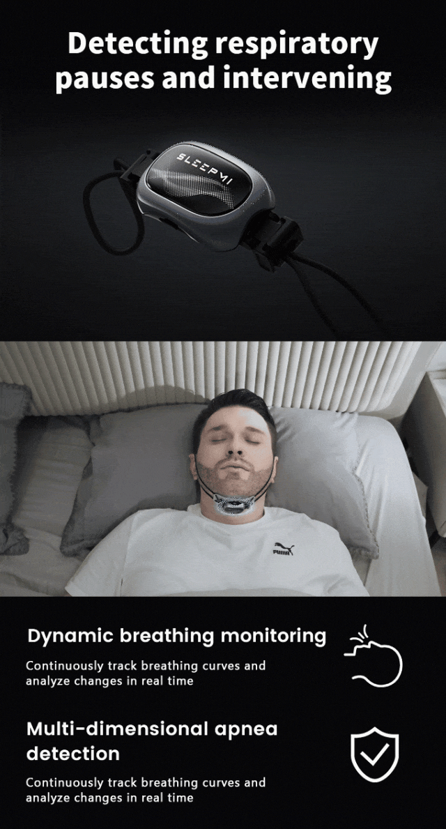 该设备可持续监测呼吸曲线,分析呼吸变化,并结合血氧、心率等算法,全面判断呼吸暂停。当检测到呼吸暂停时,会利用不同强度的脉冲进行干预,调节呼吸节律,帮助用户恢复正常呼吸。