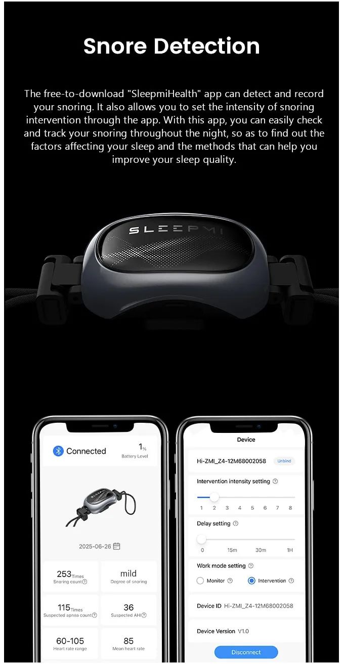 Sleepmi是一款基于人工智能技术的智能设备,专为改善睡眠问题而设计。不同于市场上常见的产品,它采用更为精准可靠的打鼾检测方法——非通过易受环境噪声影响的语音识别,而是通过捕捉打鼾频率,结合身体运动和睡眠检测等多维度数据,通过综合算法准确判断打鼾状况。