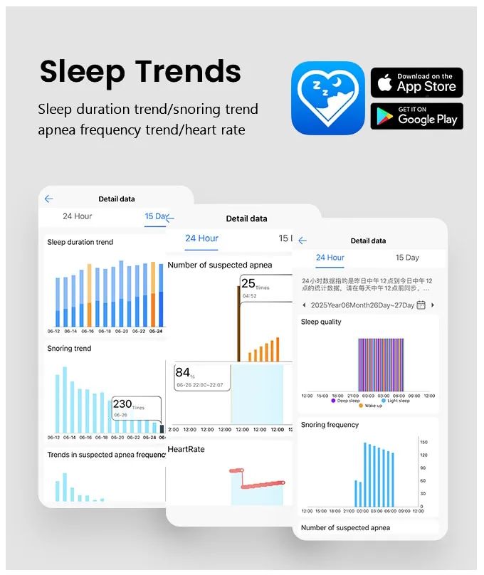 结合呼吸曲线、血氧、心率等多维信息,并通过APP进行睡眠数据分析,直观呈现睡眠状态,帮助用户了解睡眠状况。