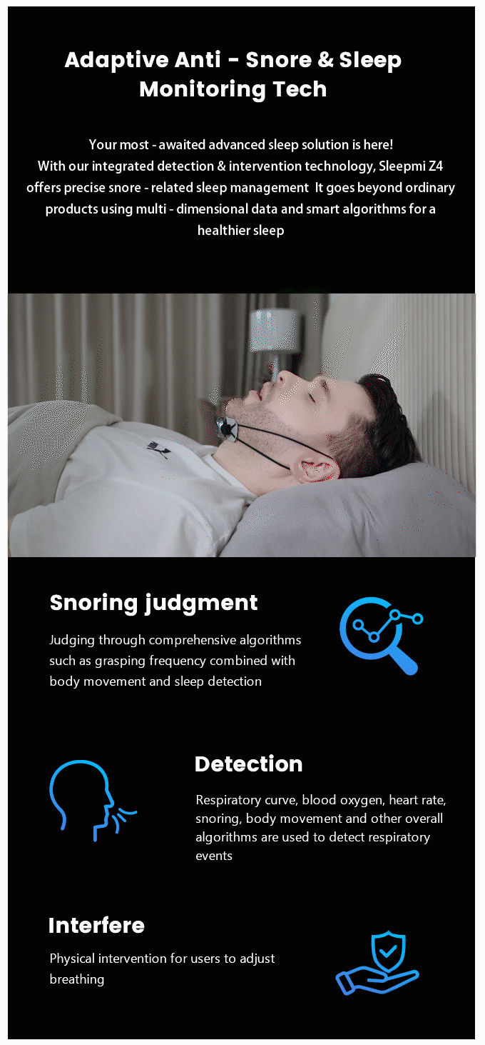 Sleepmi Z4打鼾阻断器深知被打鼾困扰的无奈,基于人工智能的精准算法识别睡眠状态,多维度呼吸监测,协助调节呼吸节律,其贴心设计帮助屏蔽干扰,缓解不适,让你摆脱每晚被打鼾主导的疲惫,重获宁静安睡。