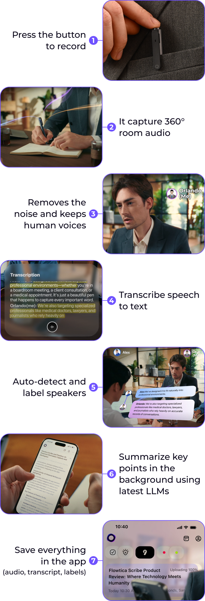 咖啡厅、展会或活动现场、快节奏的对话、嘈杂的环境......Flowtica Scribe 配备高灵敏度全向麦克风,无论身处何地都能清楚捕捉语音。