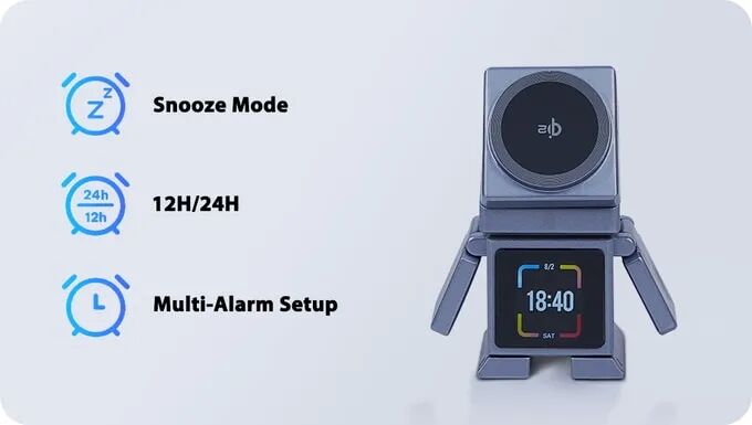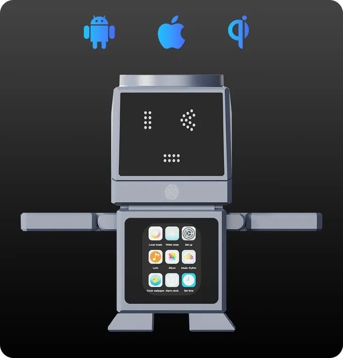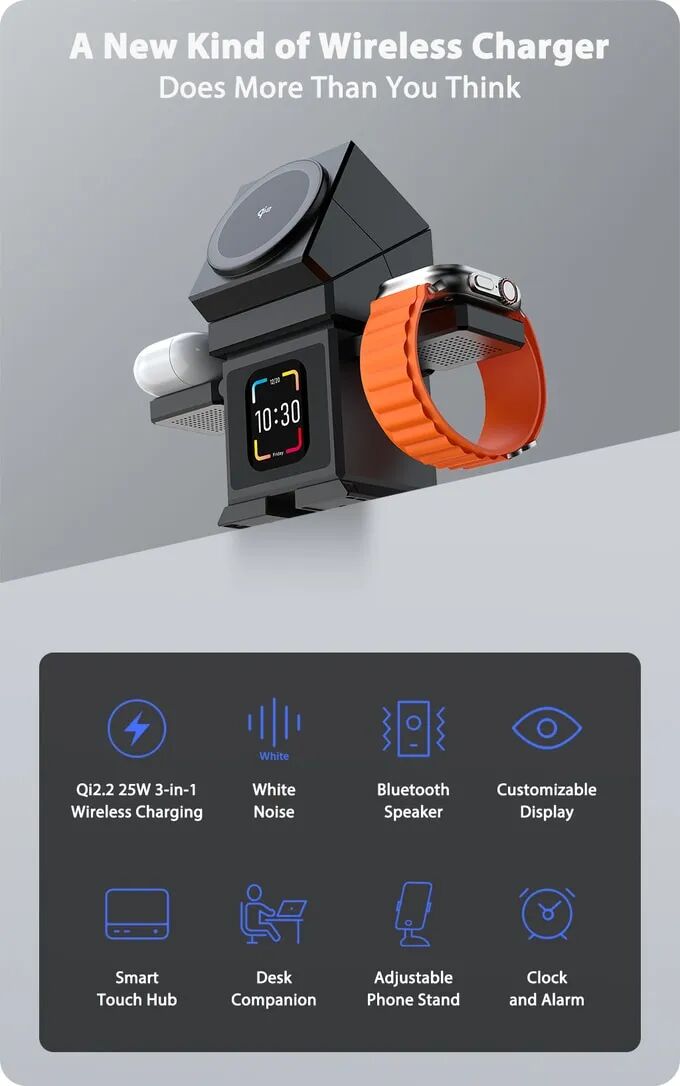 其独特外观设计提供集中高效的充电解决方案,超越传统充电器,成为个人能量中心,内置蓝牙音箱、九种白噪声模式等功能及3英寸触控屏,便于全面操控。