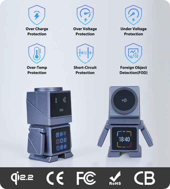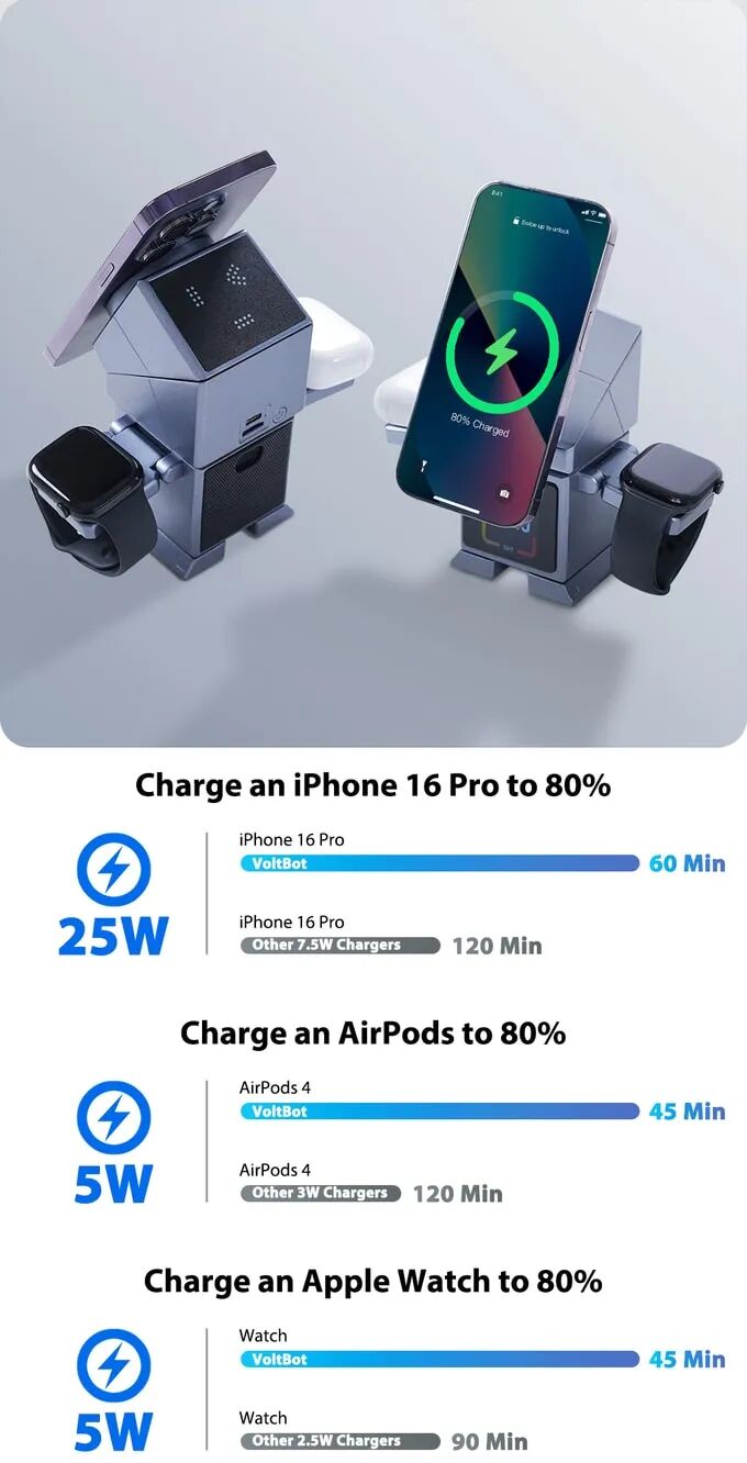 无需专用充电器,VoltBot支持苹果、Qi认证及安卓设备,兼容智能手机、智能手表及耳机等多类无线充电需求,一站式解决方案。