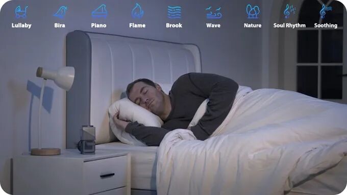 内置TF卡槽预装九首白噪声曲目,帮助用户营造理想睡眠环境,轻松入眠,醒来精神焕发。