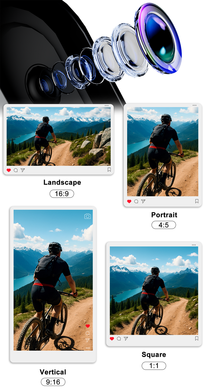 内容格式随心切换。只需轻按按钮,即可在竖屏和横屏之间切换。竖屏适合TikTok、Reels和短视频,宽屏适合YouTube和Vlog,无需裁剪。只需一键,即刻分享,展现最佳效果。