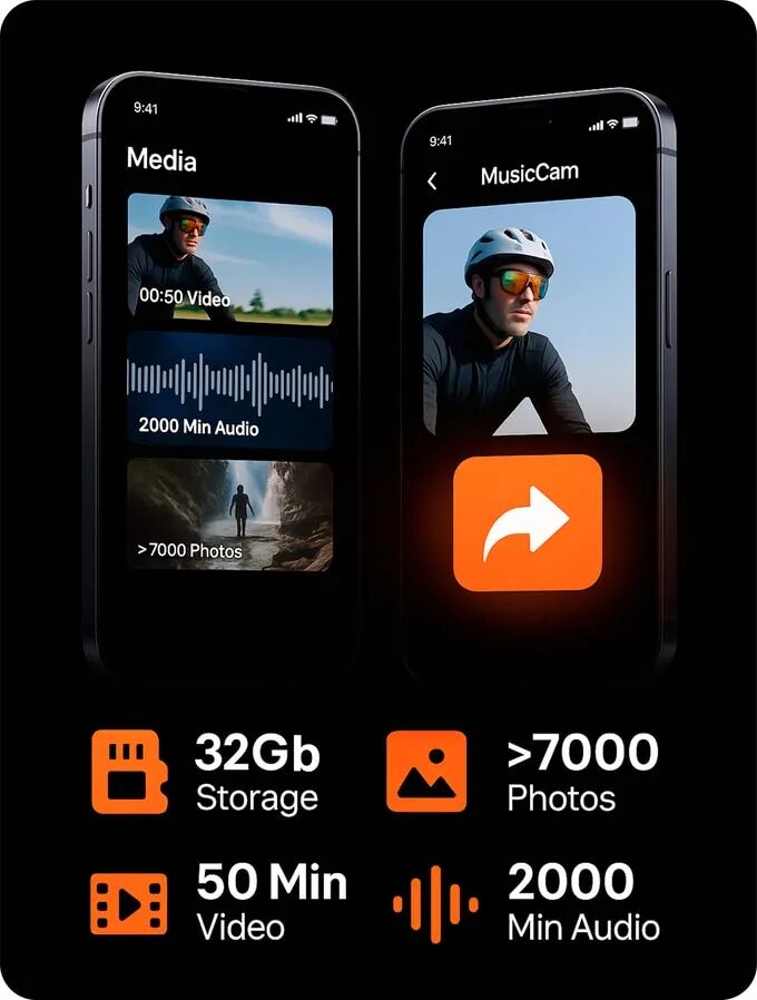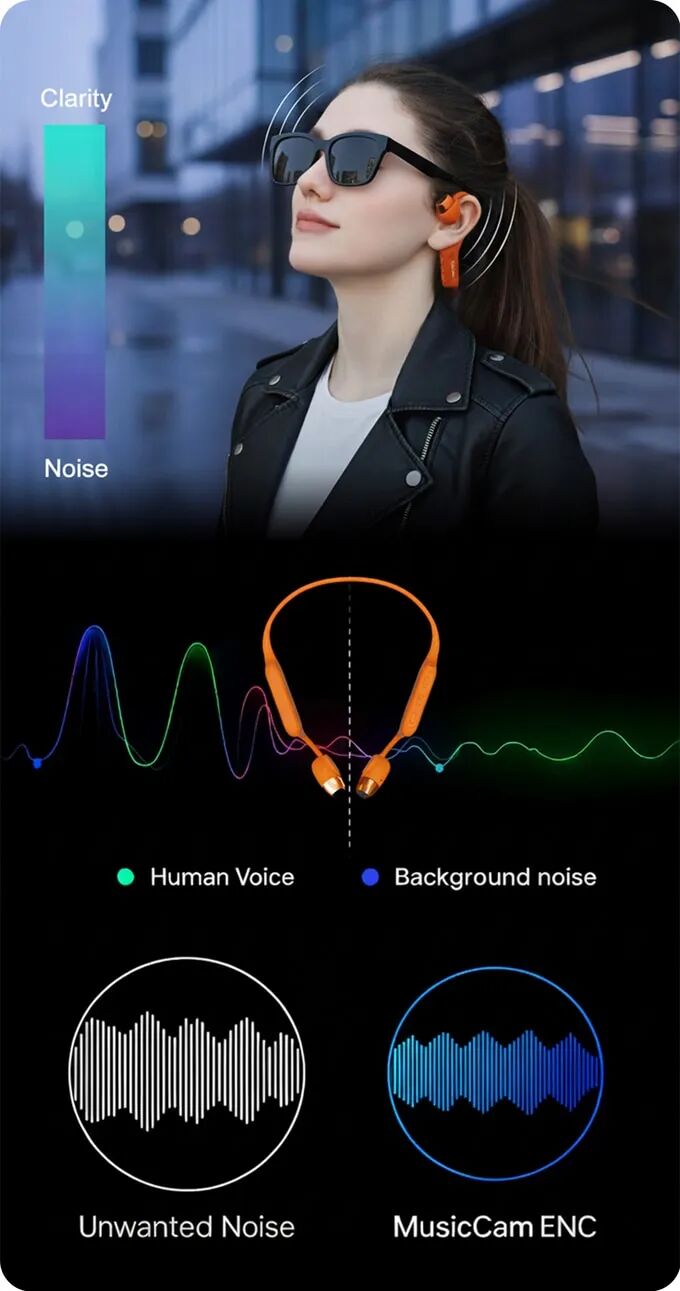 MusicCam配备双ENC(环境噪声抑制)麦克风,有效隔离风声、交通噪音或人群喧哗。无论高速骑行还是繁忙街头,语音清晰同步视频,无需外接麦克风。