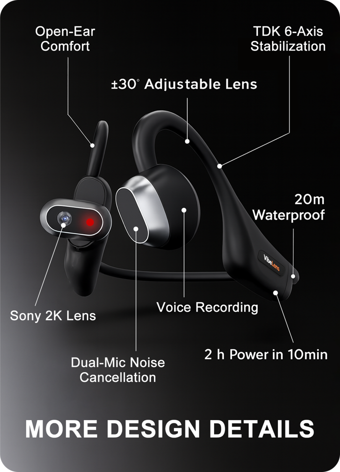 传统方案需佩戴运动相机、智能眼镜和耳机,才能满足基本需求。而MusicCam将一切融入一体,外形简洁。稳定录制2K高清画面,捕捉清晰音频,享受开耳式音乐——无缠绕的绑带、无沉重背包、无妥协。