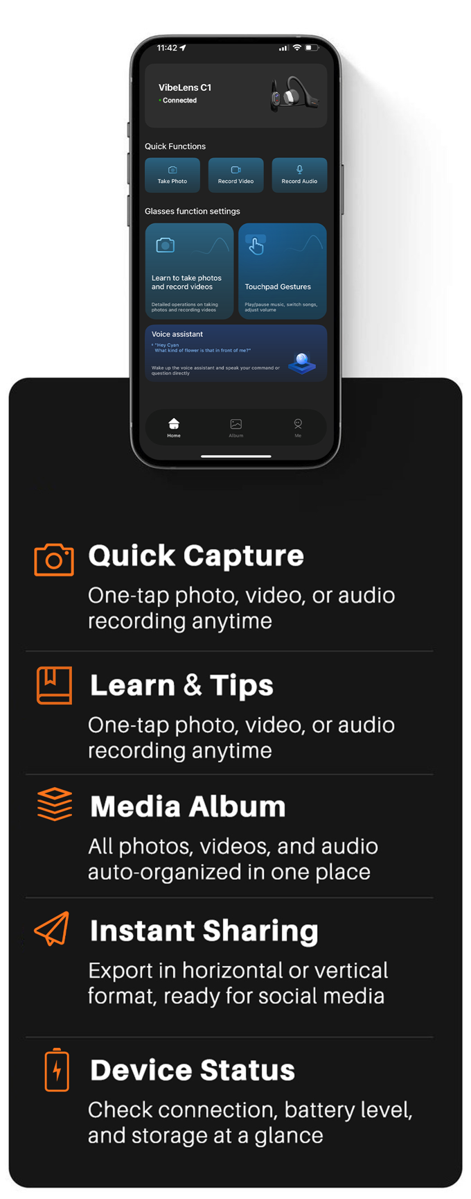MusicCam融合了开耳式音频与稳定的第一视角摄像头,轻巧便携。听音乐、接电话、录制2K视频——一站式体验,无需额外设备。设备更少,充电更少,自由度更高。