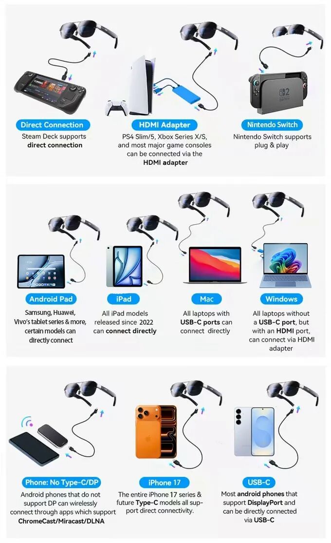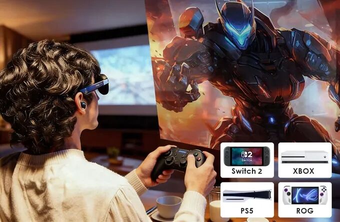 VIZO Z1 Pro 可与游戏机、智能手机、平板电脑和电脑无缝连接,将几乎任何设备变成巨大的私人屏幕。从PS5、Xbox、Nintendo Switch到笔记本电脑、手机和掌上游戏机,无论你在哪里,它都能提供即插即用的沉浸式体验。