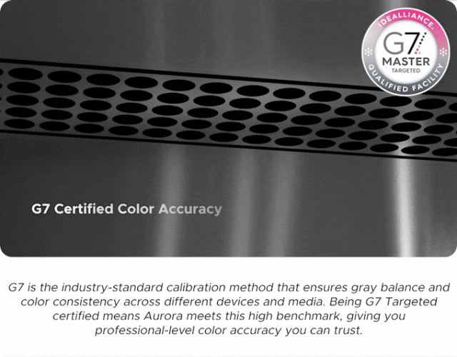 Aurora 获得 G7 Targeted 认证,可提供无与伦比的色彩一致性和保真度,确保你的打印效果始终与你的设想一致。告别反复试验的颜色调整,迎接完美、专业的品质效果。