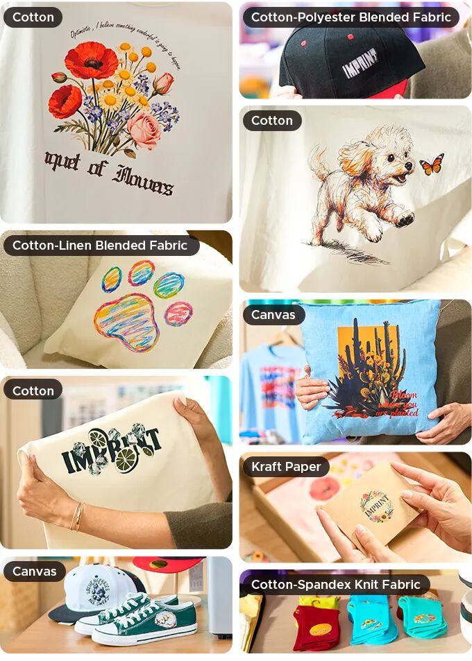 DTF数码印花技术,让你能够轻松地将任何设计印制到织物上。将你的艺术作品打印在特种胶片上,然后使用简单的热压即可将其转移到棉、涤纶、混纺、浅色或深色织物上——无需复杂的预处理。