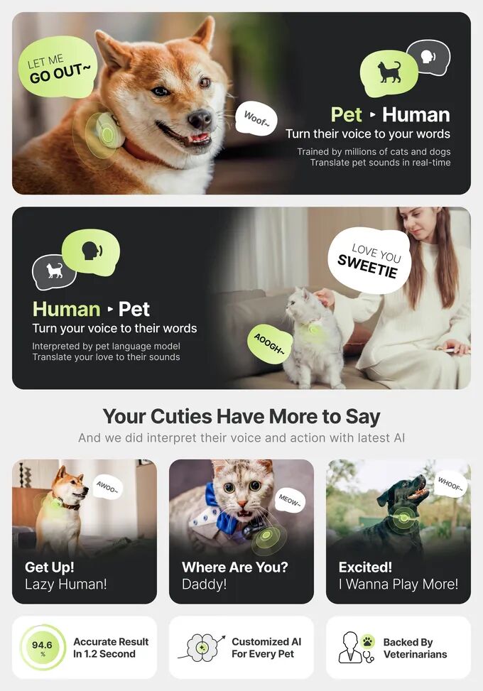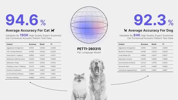 PettiChat的Pet-LLM基于超过150万个真实世界样本训练,并得到同行评审研究的支持,实现了94.6%的语境准确率。