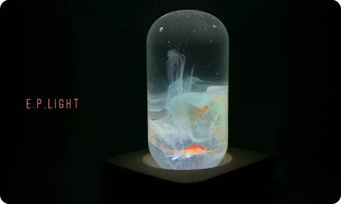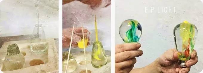 通过在灯泡内随意注射油漆和各色液体,让其自由描绘不同的意象,再凝固定格,最后成为形态各异的艺术品。